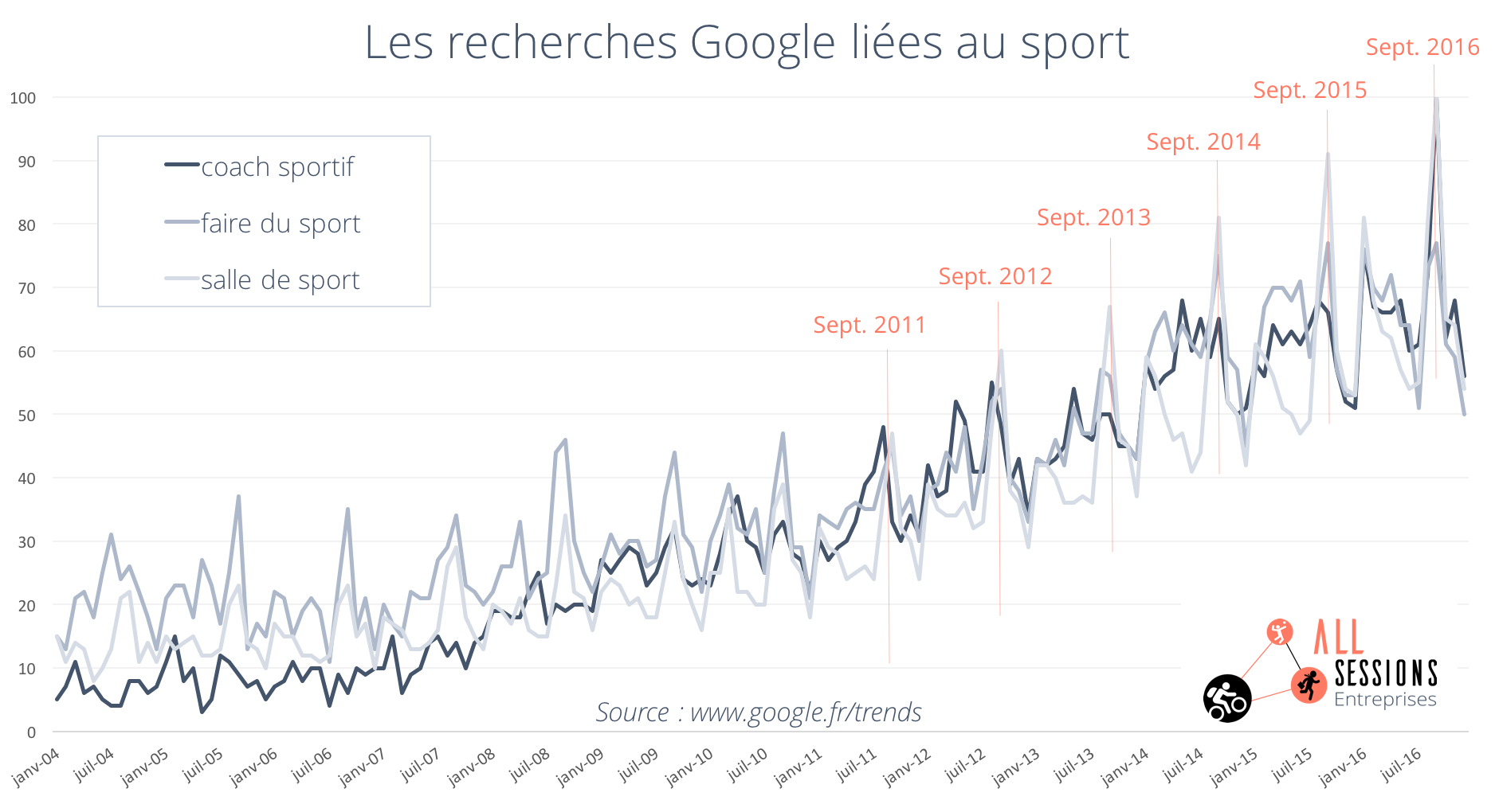 C’est la période à laquelle, revigoré par la pause estivale et pleins de bonnes résolutions, nous décidons de nous mettre ou nous remettre au sport. Nous recherchons alors quelle activité reprendre cette année, qui convienne à la fois à nos objectifs, nos goûts et nos emplois du temps bien chargés. Google en atteste :